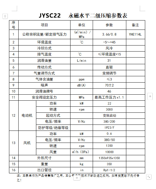 產品名稱:22kW 水平雙級直連永磁變頻空壓機 JYSC22
